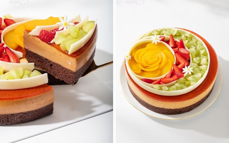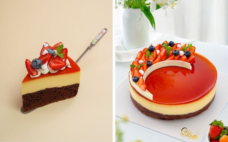 Flan Gato Trái Cây – “nữ hoàng” trong dòng Flan với sự kết hợp độc đáo giữa flan mềm mịn, béo ngậy, cốt gato sô-cô-la đắng nhẹ và dàn trái cây chua ngọt tươi mát: dâu tây, việt quất, đào. Viền kem trắng mịn màng tôn lên vẻ đẹp đầy đặn, cùng vụn bánh gato tạo nên sự hài hòa về cả hương vị lẫn thẩm mỹ.